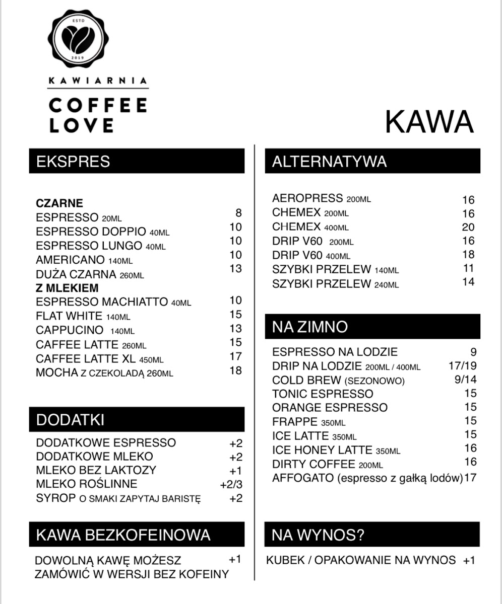 Welcome to CoffeeLove, a charming little cafe nestled in Biała Podlaska. This delightful spot offers an array of hot and cold beverages to satisfy every palate. Savor their rich hot chocolates and velvety kakao, available for just PLN 7.00 each, or indulge in a perfectly frothed warm milk with syrup for PLN 5.00.